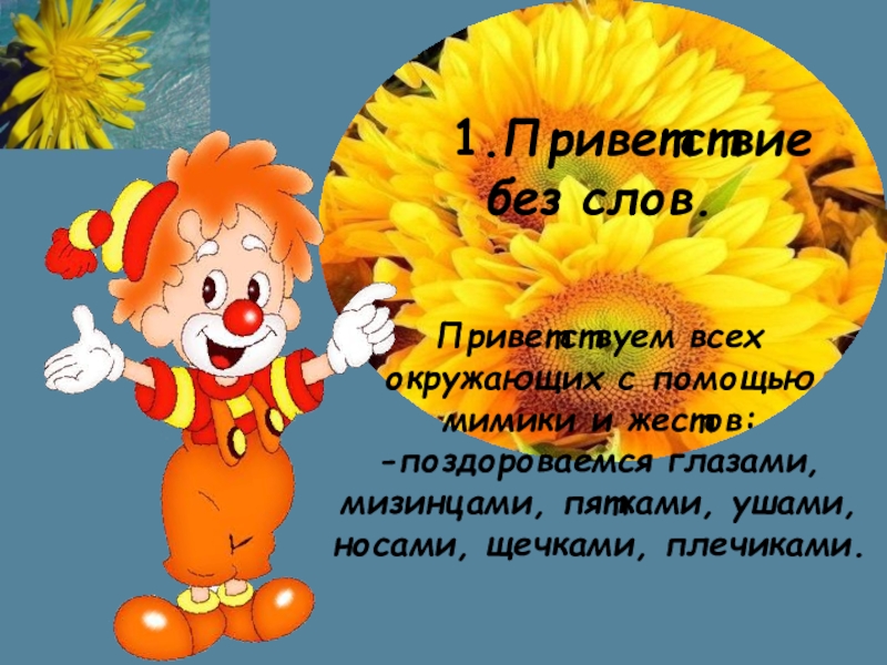 -поздороваемся глазами, мизинцами, пятками, ушами, носами, щечками, плечиками.