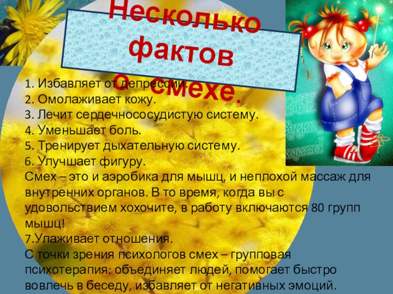 С точки зрения психологов смех – групповая психотерапия: объединяет людей, помогает быстро вовлечь в беседу, избавляет от негативных эмоций.