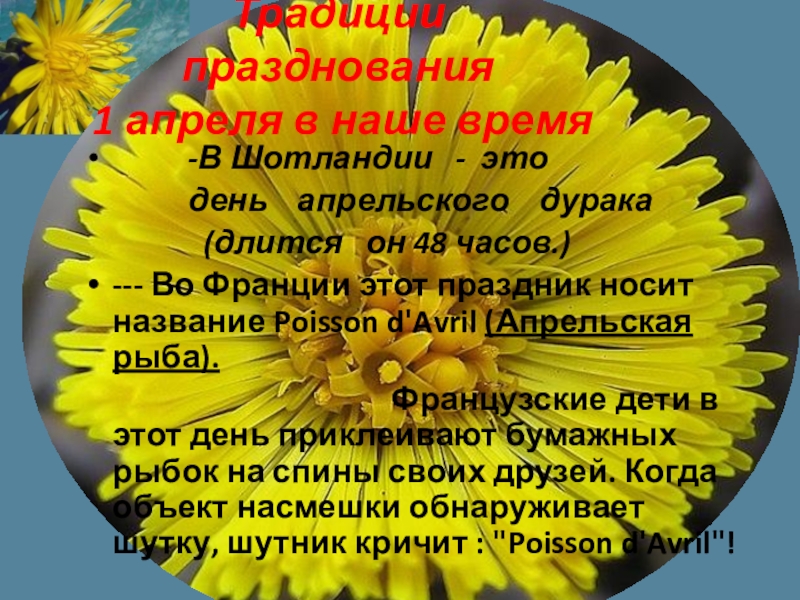 --- Во Франции этот праздник носит название Poisson d'Avril (Апрельская рыба).