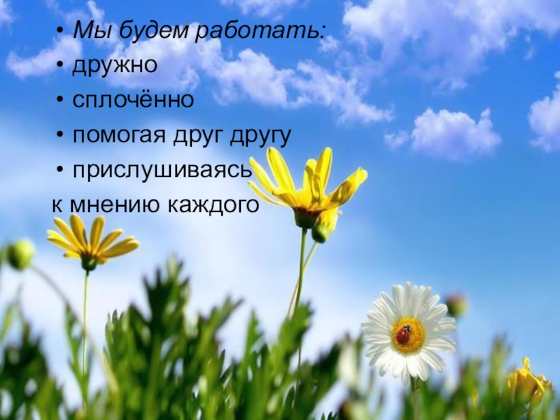 Мы будем работать:дружносплочённопомогая друг другуприслушиваясь к мнению каждого