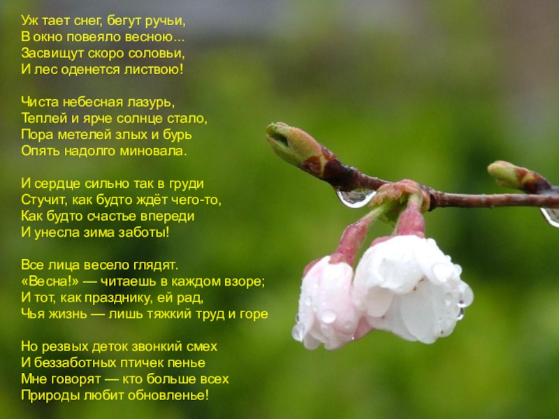 Уж тает снег, бегут ручьи,В окно повеяло весною...Засвищут скоро соловьи,И лес оденется листвою! Чиста небесная лазурь,Теплей и ярче
