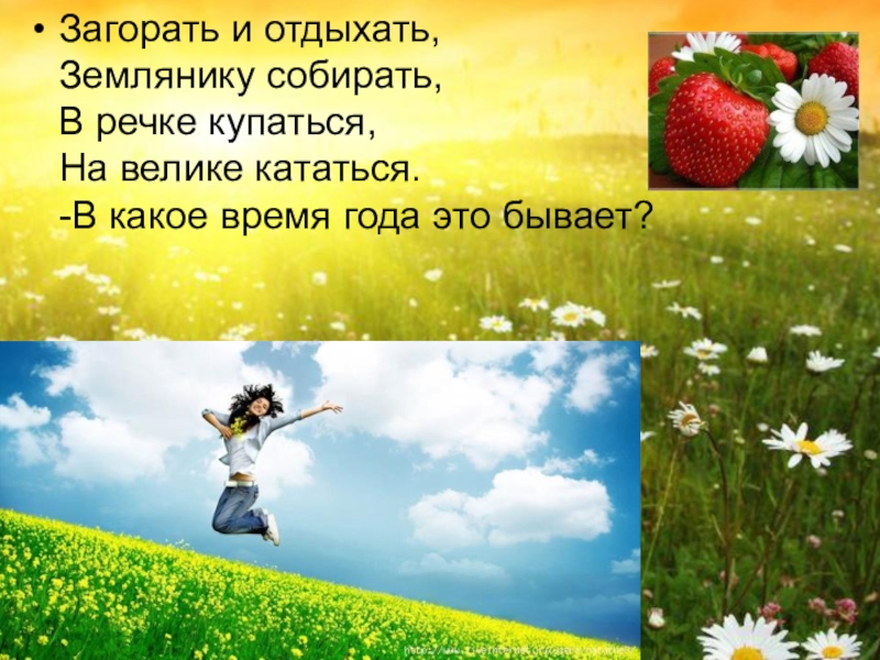 Загорать и отдыхать, Землянику собирать, В речке купаться, На велике кататься.  -В какое время года это бывает?