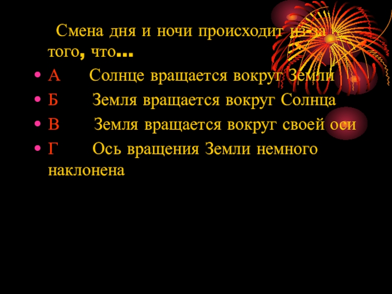 Слайд 30 Смена дня и ночи происходит из-за того, что…