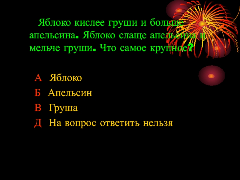 Слайд 10 Яблоко кислее груши и больше апельсина. Яблоко слаще