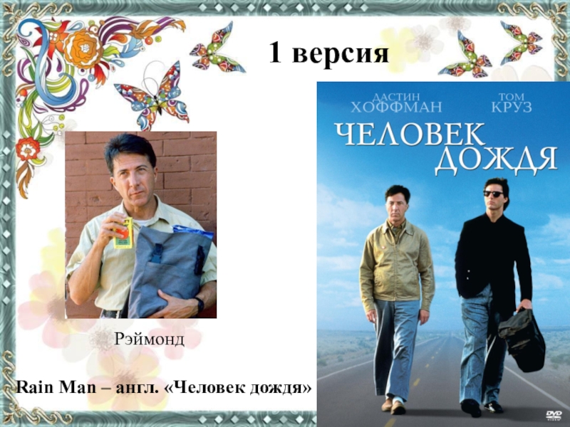 1 версияRain Man – англ. «Человек дождя» Рэймонд