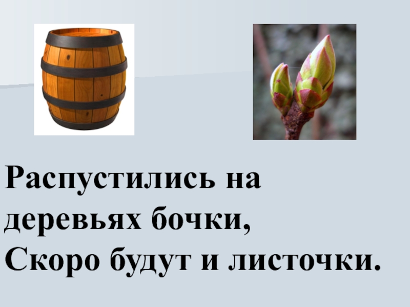 Слайд 6Распустились на деревьях бочки, Скоро будут и листочки.
