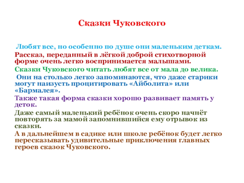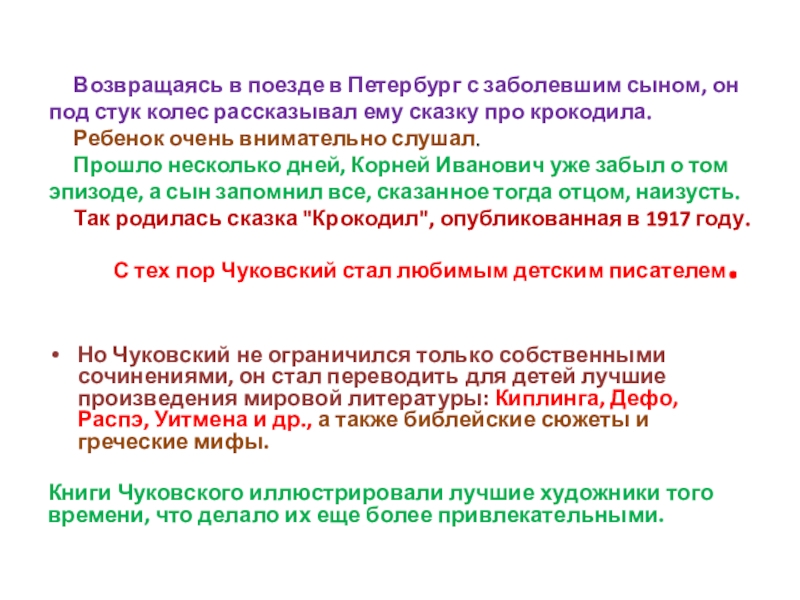 Но Чуковский не ограничился только собственными сочинениями, он стал переводить для детей лучшие произведения мировой литературы: Киплинга, Дефо, Распэ, Уитмена и др., а также библейские сюжеты и греческие мифы.