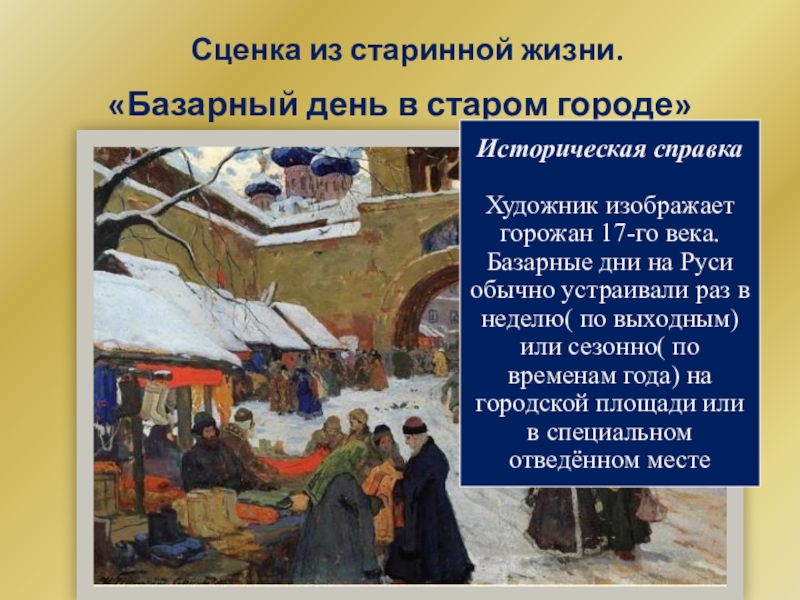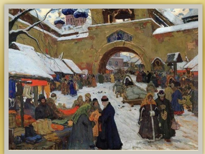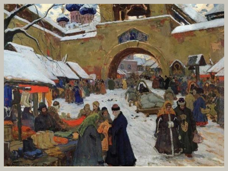 Художник изображает горожан 17-го века. Базарные дни на Руси обычно устраивали раз в неделю( по выходным) или сезонно( по временам года) на городской площади или в специальном отведённом месте