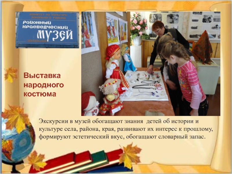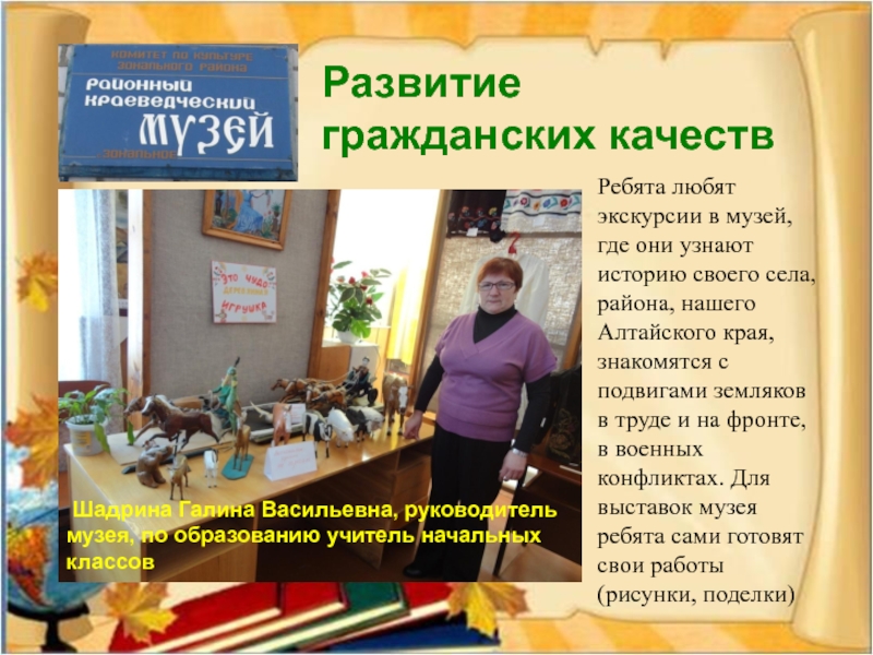 Ребята любят экскурсии в музей, где они узнают историю своего села, района, нашего Алтайского края, знакомятся с подвигами земляков в труде и на фронте, в военных конфликтах. Для выставок музея ребята сами готовят свои работы (рисунки, поделки)