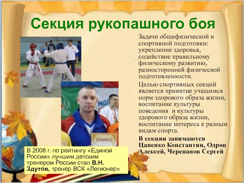 В 2008 г. по рейтингу «Единой России» лучшим детским тренером России стал В.Н. Здутов, тренер ВСК «Легионер»