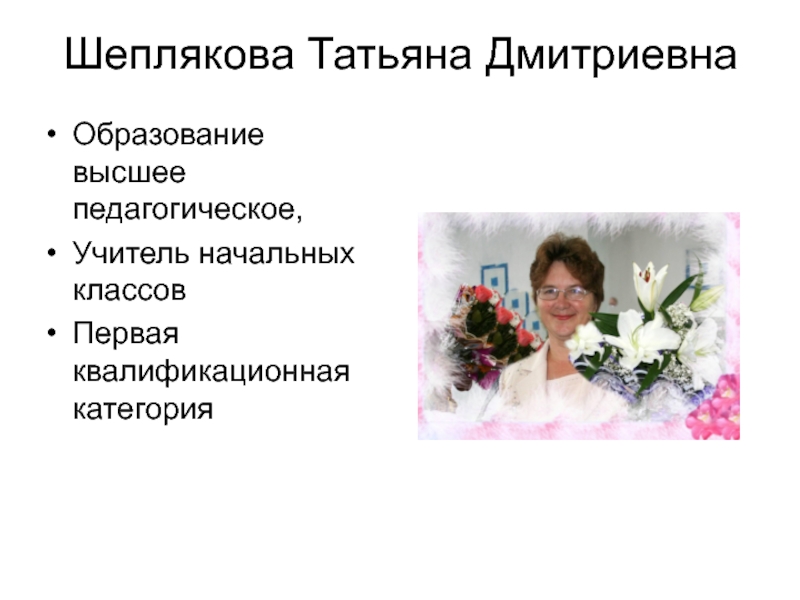 Шеплякова Татьяна ДмитриевнаОбразование высшее педагогическое,Учитель начальных классовПервая квалификационная категория