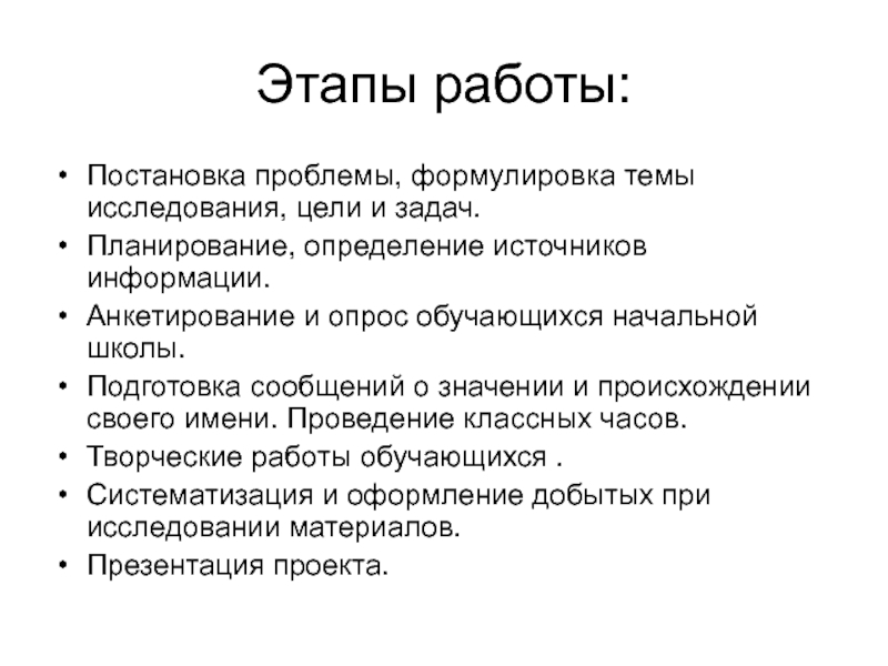 Этапы работы:Постановка проблемы, формулировка темы исследования, цели и задач.Планирование, определение источников информации.Анкетирование и опрос обучающихся начальной школы.Подготовка