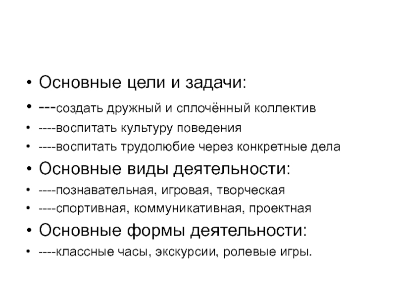 Основные цели и задачи:---создать дружный и сплочённый коллектив----воспитать культуру поведения----воспитать трудолюбие через конкретные делаОсновные виды деятельности:----познавательная, игровая,