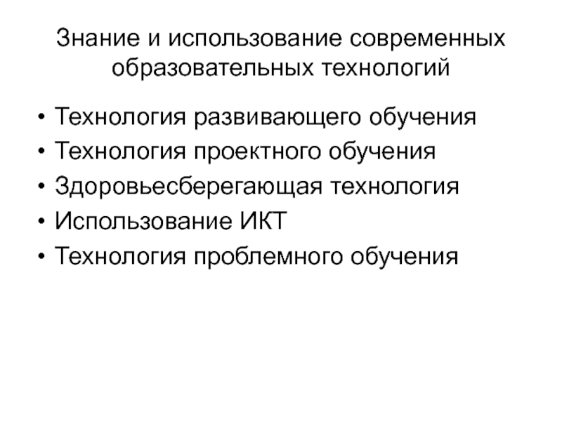 Знание и использование современных образовательных технологийТехнология развивающего обученияТехнология проектного обученияЗдоровьесберегающая технологияИспользование ИКТТехнология проблемного обучения