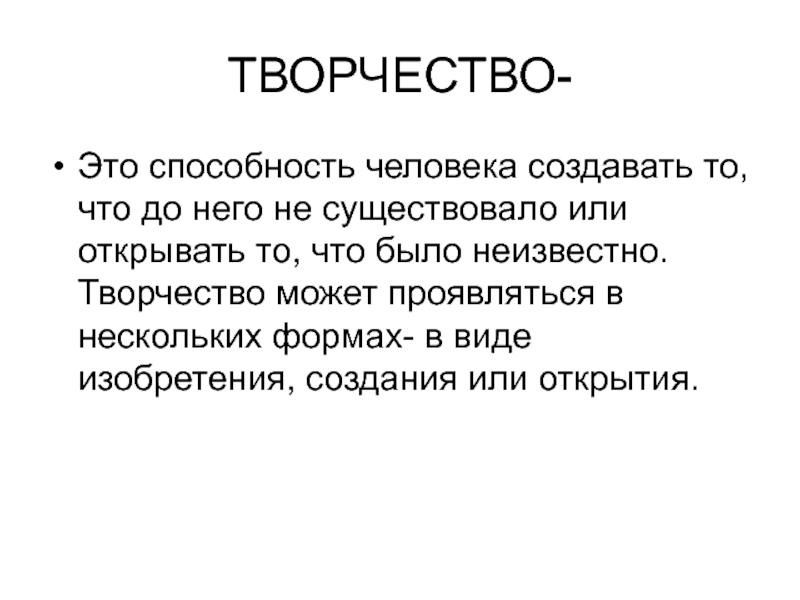 ТВОРЧЕСТВО-Это способность человека создавать то, что до него не существовало или открывать то, что было неизвестно. Творчество