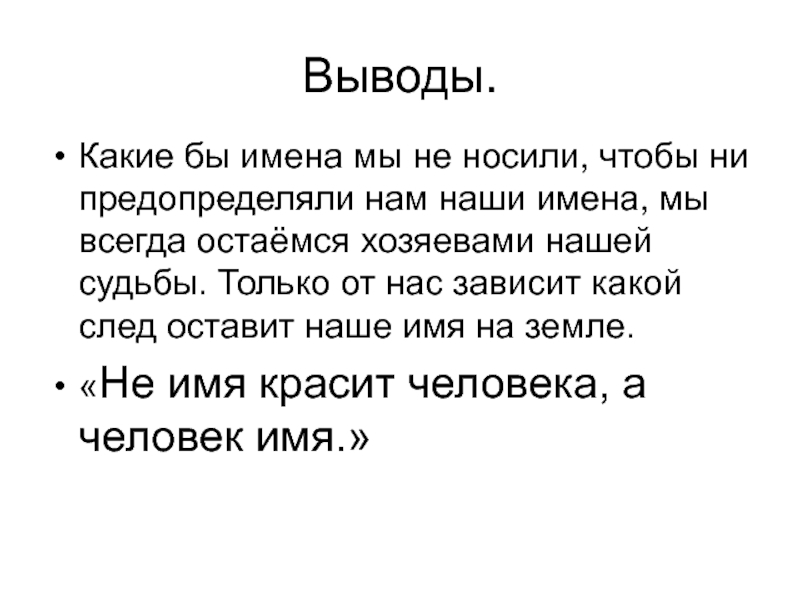 Выводы.Какие бы имена мы не носили, чтобы ни предопределяли нам наши имена, мы всегда остаёмся хозяевами нашей