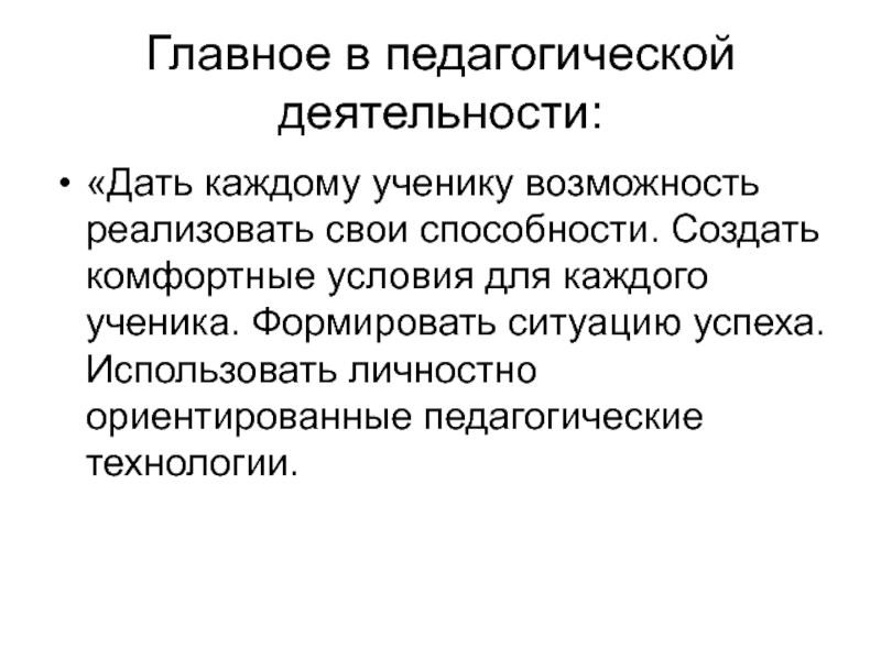 Главное в педагогической деятельности:«Дать каждому ученику возможность реализовать свои способности. Создать комфортные условия для каждого ученика. Формировать