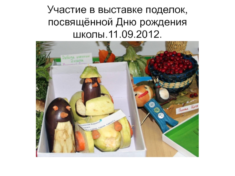 Слайд 15Участие в выставке поделок, посвящённой Дню рождения школы.11.09.2012.