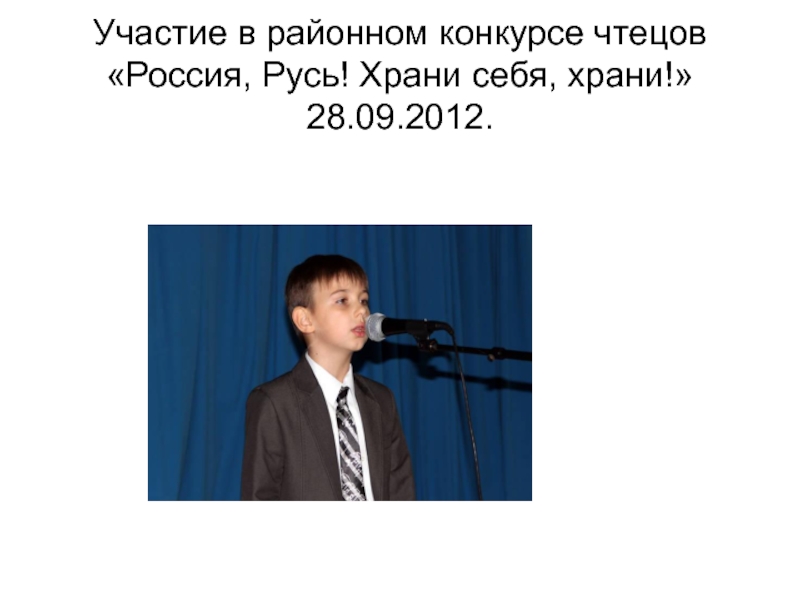 Слайд 22Участие в районном конкурсе чтецов «Россия, Русь! Храни себя, храни!» 28.09.2012.