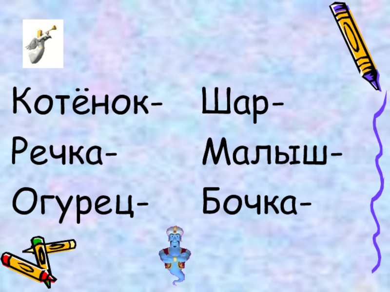 Котёнок-Речка-Огурец-Шар-Малыш-Бочка-