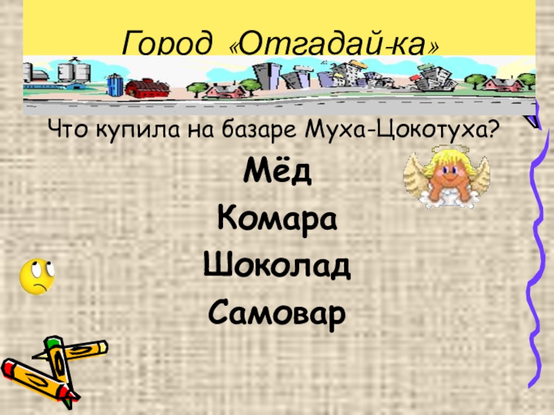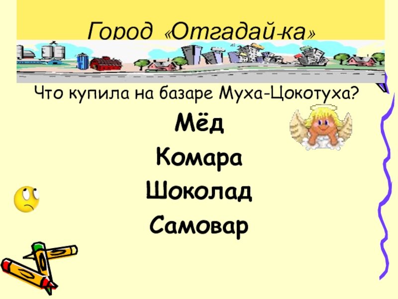 Город «Отгадай-ка»Что купила на базаре Муха-Цокотуха?МёдКомара Шоколад Самовар