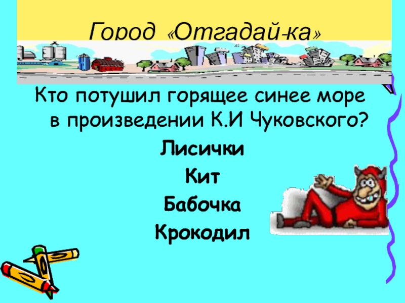 Город «Отгадай-ка»Кто потушил горящее синее море в произведении К.И Чуковского?ЛисичкиКитБабочка Крокодил