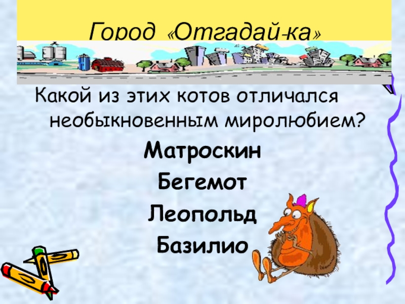 Город «Отгадай-ка»Какой из этих котов отличался необыкновенным миролюбием?МатроскинБегемот Леопольд Базилио