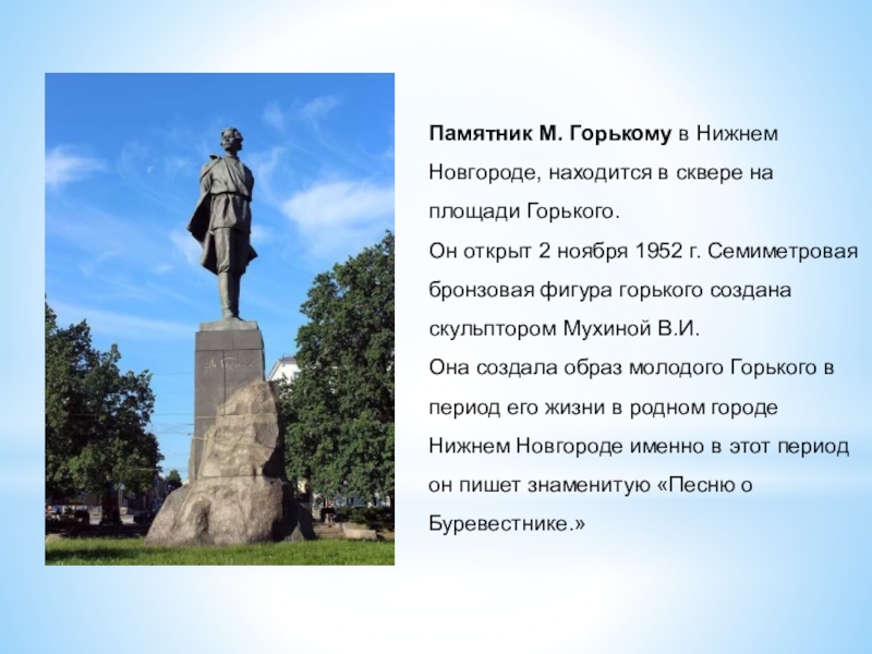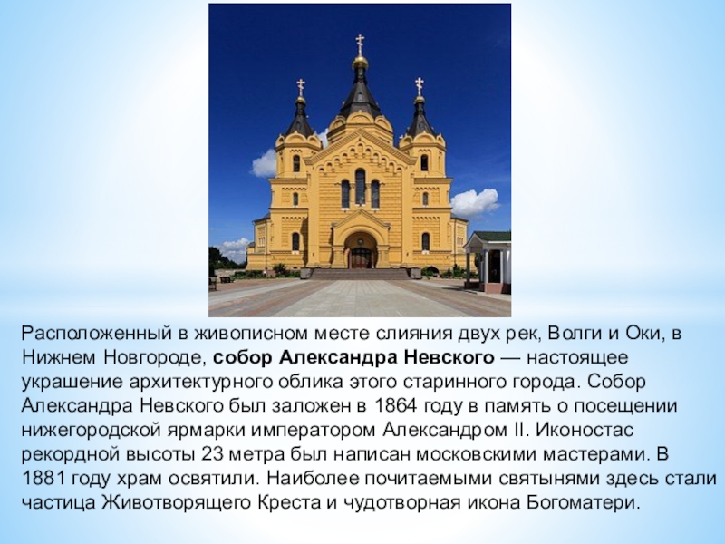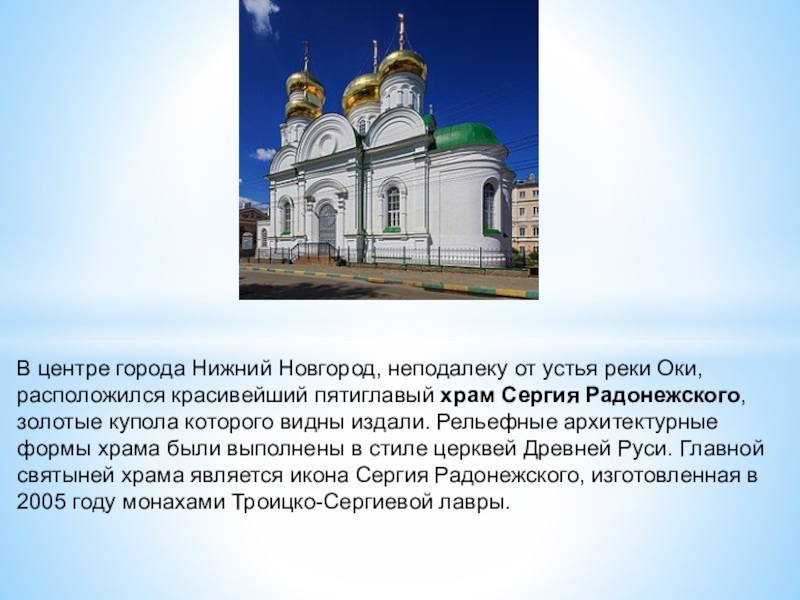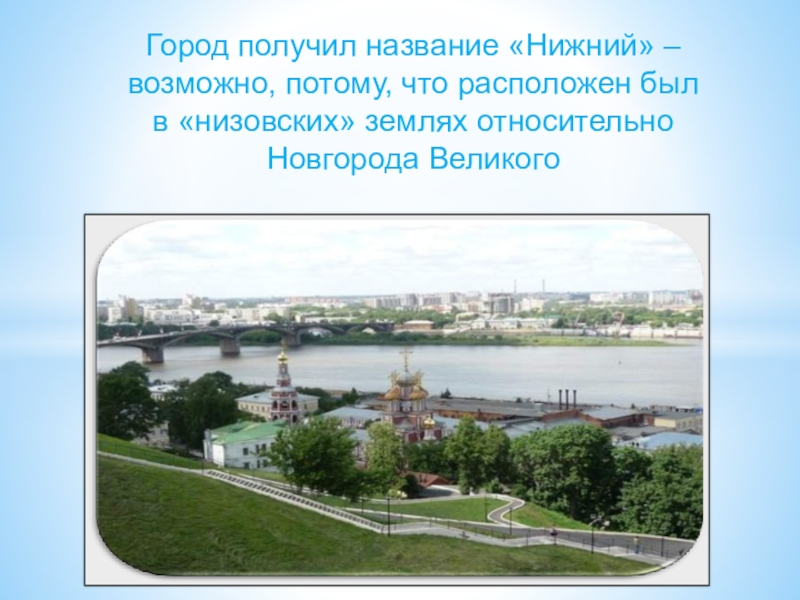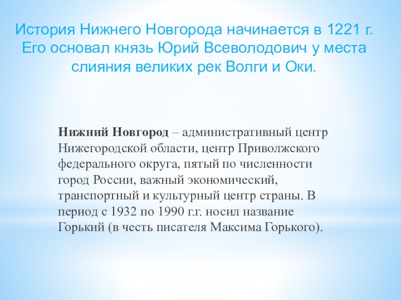 Нижний Новгород – административный центр Нижегородской области, центр Приволжского федерального округа, пятый по численности город России, важный экономический, транспортный и культурный центр страны. В период с 1932 по 1990 г.г. носил название Горький (в честь писателя Максима Горького).