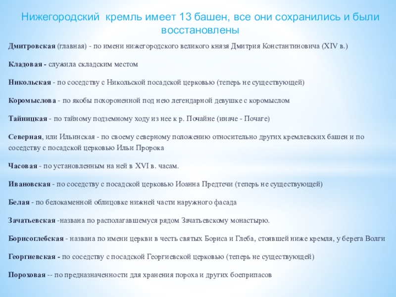 Нижегородский кремль имеет 13 башен, все они сохранились и были восстановлены