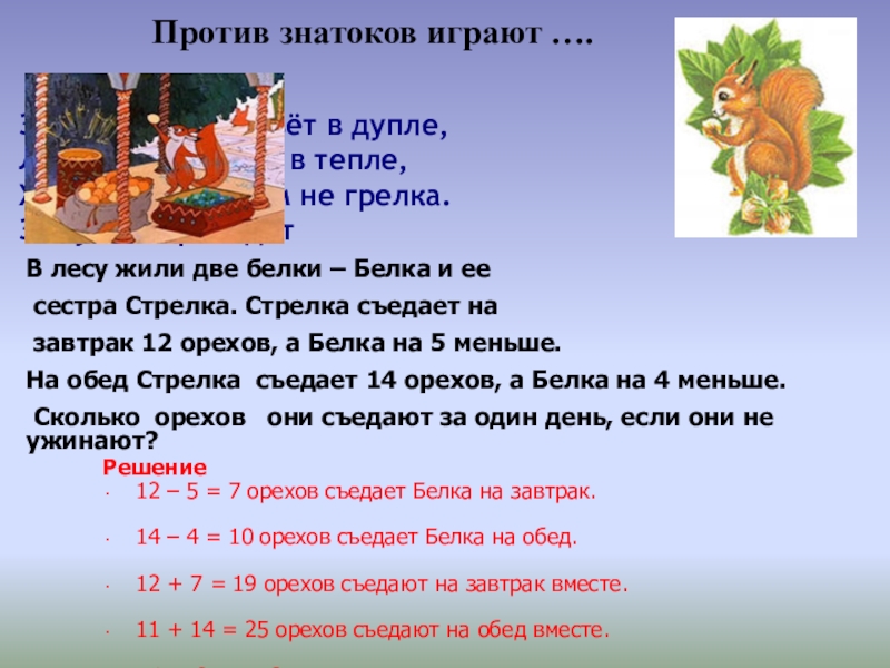 12 – 5 = 7 орехов съедает Белка на завтрак.