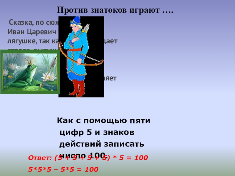 Сказка, по сюжету которой Иван Царевич женится на лягушке, так как в неё попадает стрела, выпущенная им по велению отца. Лягушка оказывается Василисой Премудрой, которая выполняет все задания царя