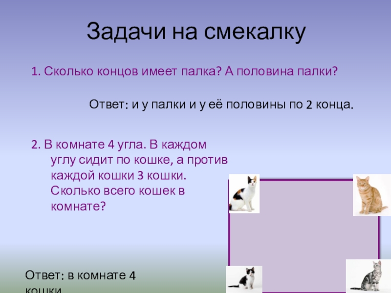 2. В комнате 4 угла. В каждом углу сидит по кошке, а против каждой кошки 3 кошки. Сколько всего кошек в комнате?