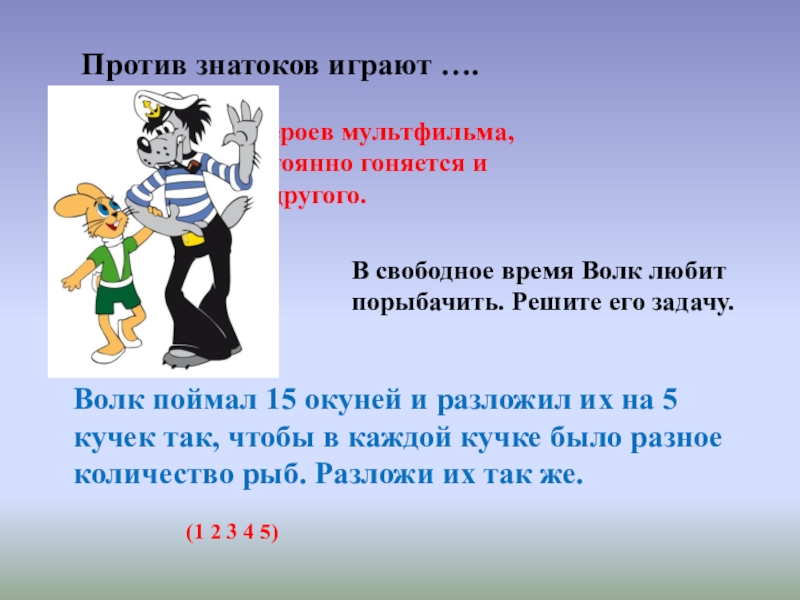 Волк поймал 15 окуней и разложил их на 5 кучек так, чтобы в каждой кучке было разное количество рыб. Разложи их так же.