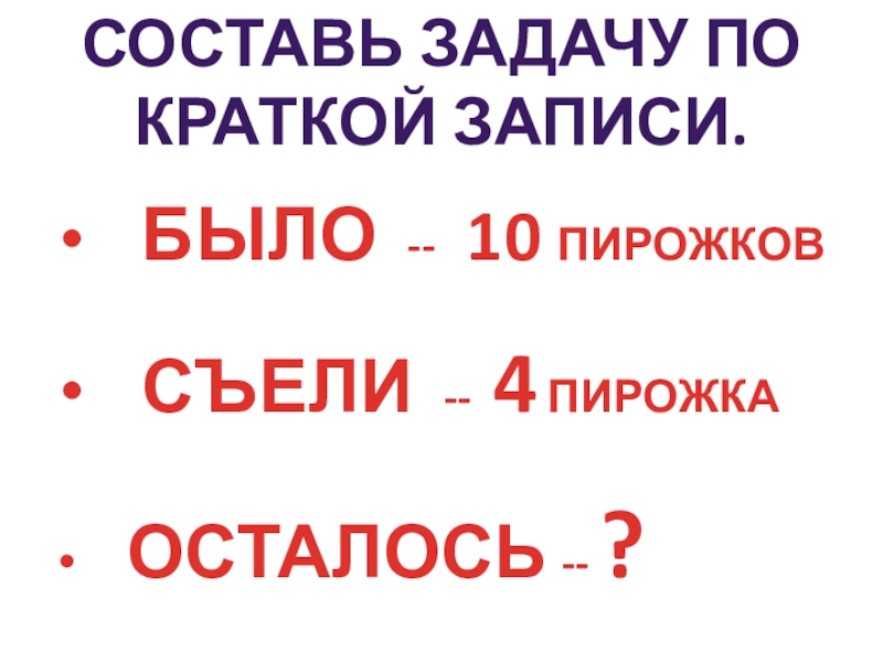 СОСТАВЬ ЗАДАЧУ ПО КРАТКОЙ ЗАПИСИ.  БЫЛО --  10 ПИРОЖКОВ  СЪЕЛИ -- 4 ПИРОЖКА