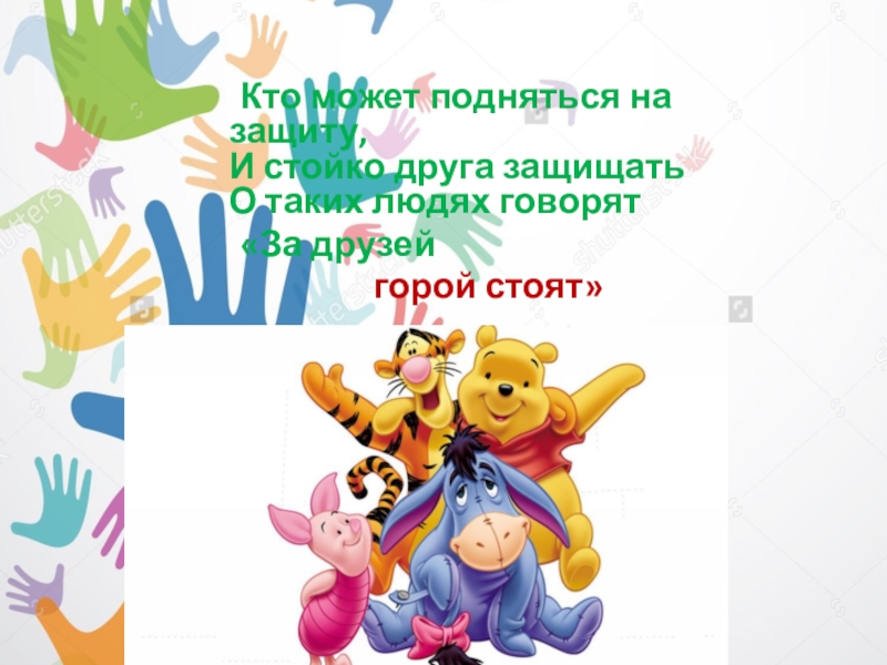 Кто может подняться на защиту, И стойко друга защищать О таких людях говорят	«За друзей 				горой стоят»