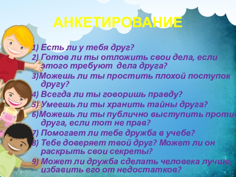 АНКЕТИРОВАНИЕ1) Есть ли у тебя друг? 2) Готов ли ты отложить свои дела, если этого требуют дела