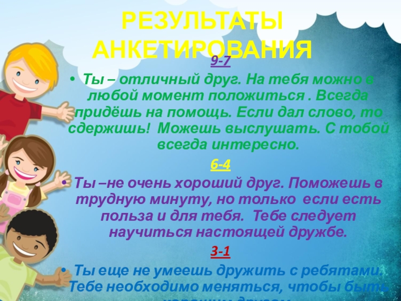 РЕЗУЛЬТАТЫ АНКЕТИРОВАНИЯ9-7  Ты – отличный друг. На тебя можно в любой момент положиться . Всегда придёшь