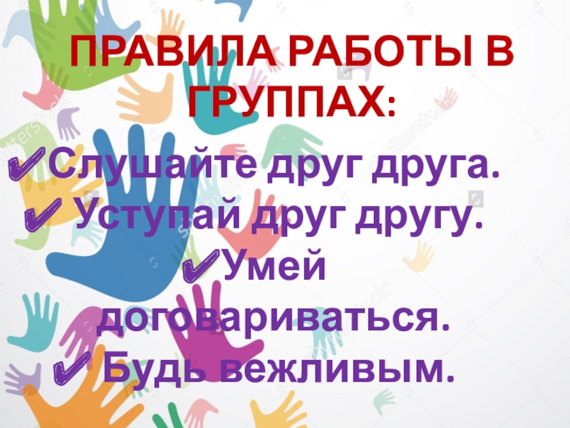 Правила работы в группах:Слушайте друг друга. Уступай друг другу.Умей договариваться. Будь вежливым.