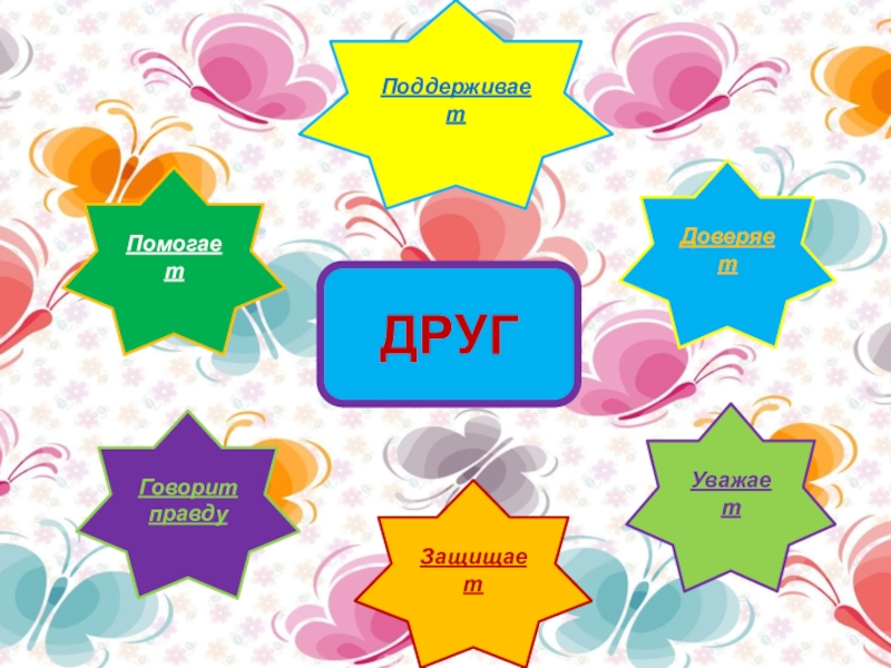 ДРУГПомогаетДоверяетГоворит правдуЗащищаетУважаетПоддерживает