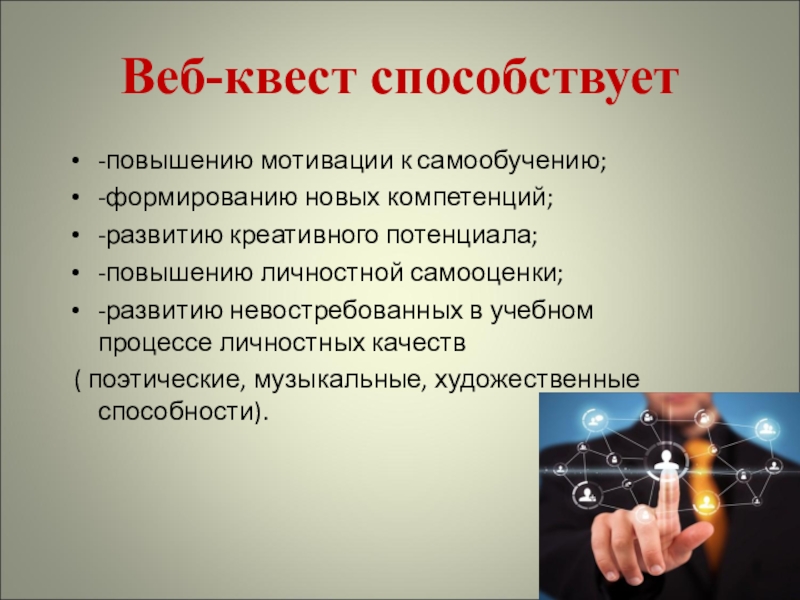 Это сайт презентаций, где можно хранить и обмениваться своими презентациями, докладами, проектами, шаблонами в формате PowerPoint с другими пользователями. Мы помогаем школьникам, студентам, учителям, преподавателям хранить и обмениваться учебными материалами.