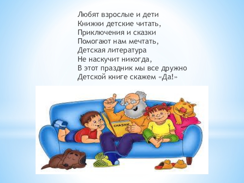 Слайд 8Любят взрослые и дети Книжки детские читать, Приключения и сказки Помогают нам мечтать, Детская литература Не