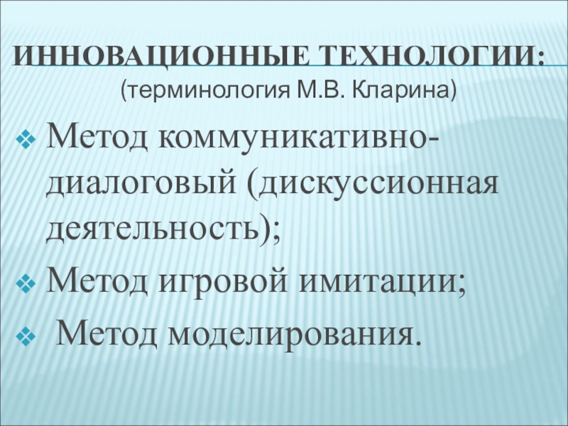ИННОВАЦИОННЫЕ ТЕХНОЛОГИИ:(терминология М.В. Кларина)Метод коммуникативно- диалоговый (дискуссионная деятельность);Метод игровой имитации; Метод моделирования.