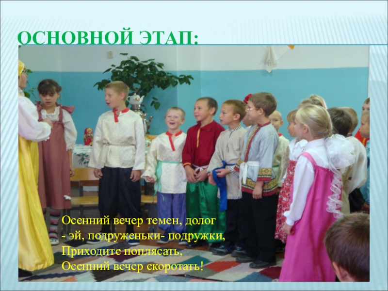 ОСНОВНОЙ ЭТАП:Осенний вечер темен, долог- эй, подруженьки- подружки,Приходите поплясать, Осенний вечер скоротать!