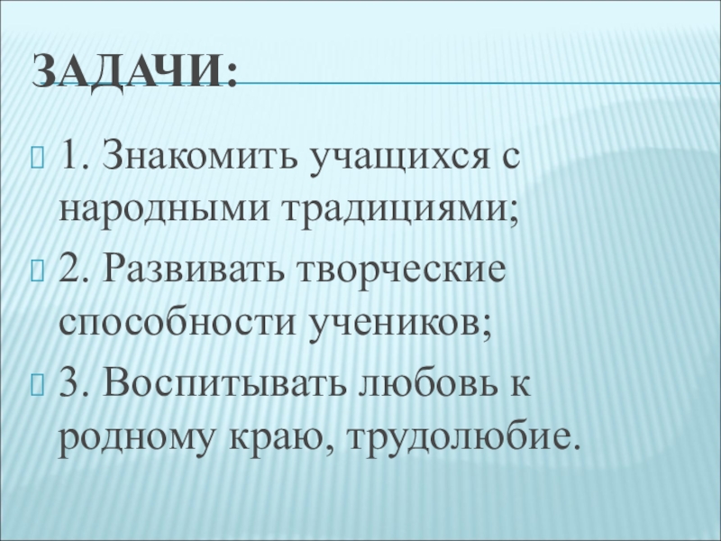ЗАДАЧИ:1. Знакомить учащихся с народными традициями;2. Развивать творческие способности учеников;3. Воспитывать любовь к родному краю, трудолюбие.