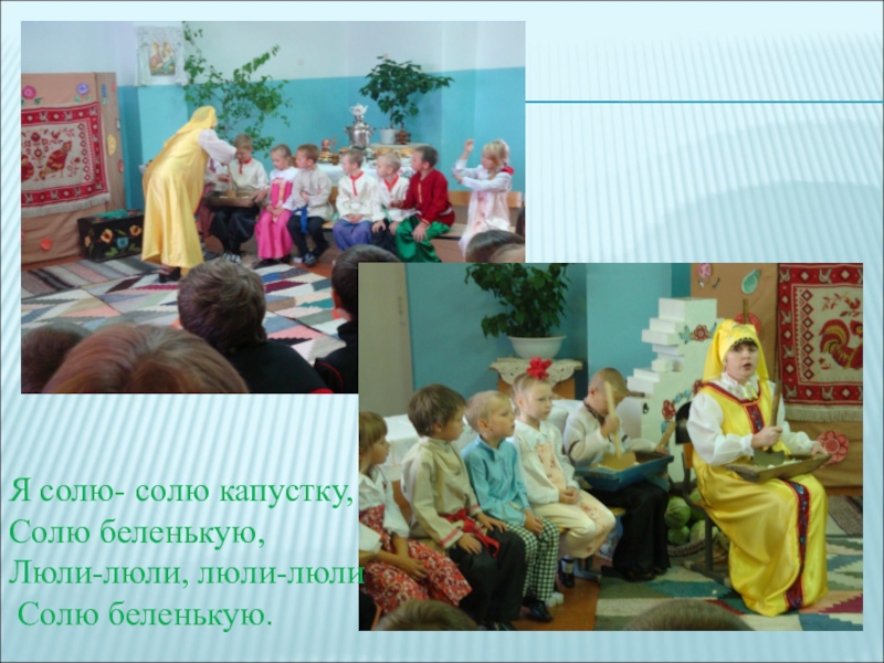 Я солю- солю капустку,Солю беленькую,Люли-люли, люли-люли Солю беленькую.