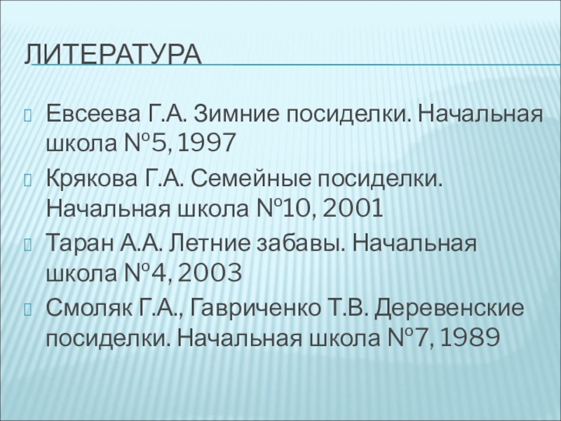 ЛИТЕРАТУРАЕвсеева Г.А. Зимние посиделки. Начальная школа №5, 1997Крякова Г.А. Семейные посиделки. Начальная школа №10, 2001Таран А.А. Летние