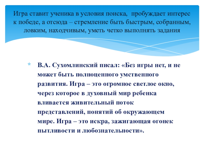 Игра ставит ученика в условия поиска, пробуждает интерес к победе, а отсюда – стремление быть быстрым, собранным, ловким, находчивым, уметь четко выполнять задания