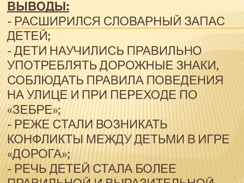 соблюдать правила поведения на улице и при переходе по «зебре»; - Реже стали возникать конфликты между детьми в игре «дорога»; - Речь детей стала более правильной и выразительной.