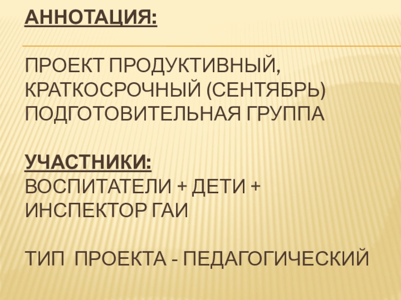 Слайд 4  Аннотация: проект Продуктивный, краткосрочный (сентябрь) подготовительная группа Участники: Воспитатели + дети + инспектор гаи Тип