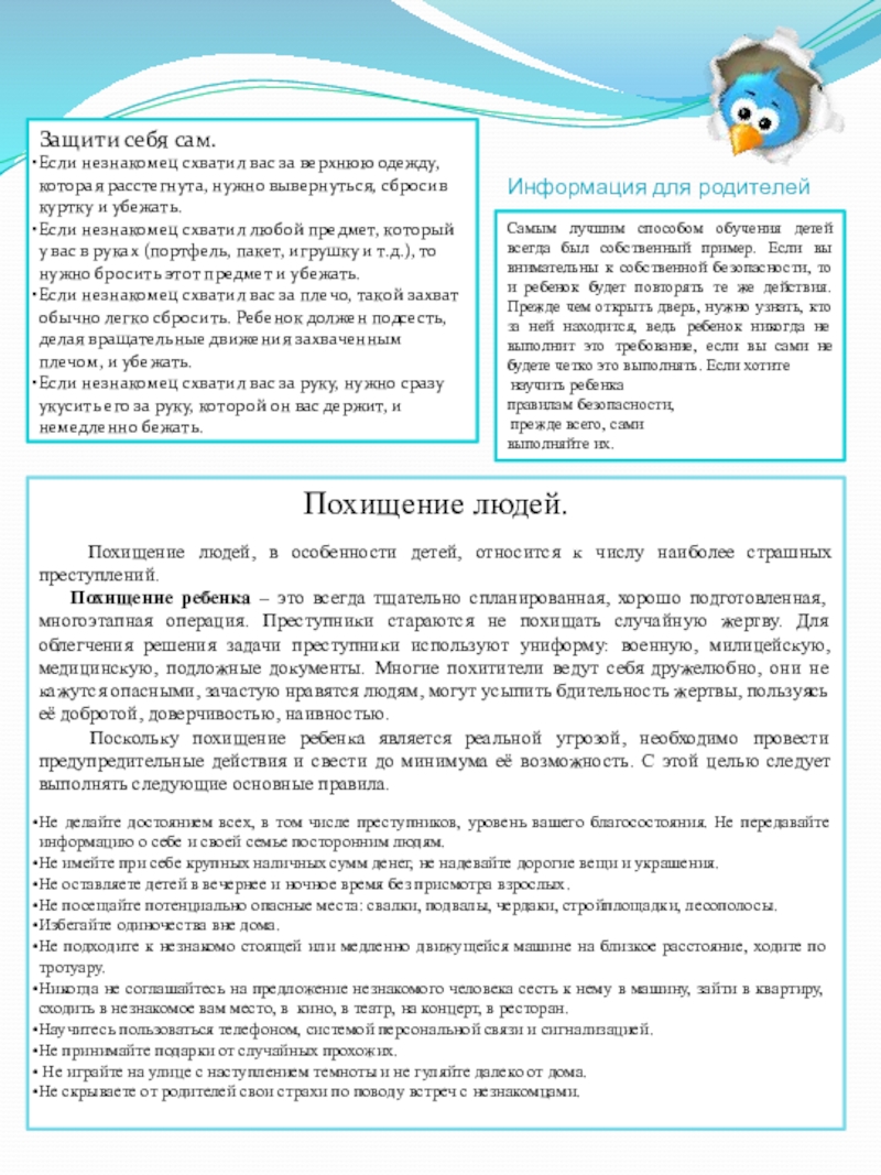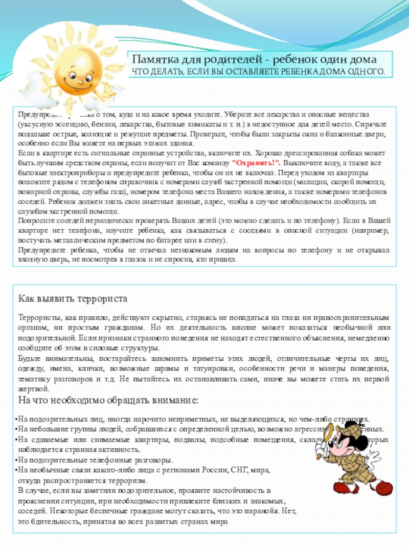 Наряду с организованной борьбой против терроризма каждый ребенок должен знать и выполнять следующие правила предупреждения и поведения в случае угрозы или возникновения террористического акта.